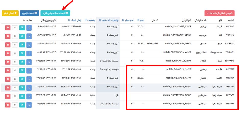اگر گزارشی از نمره نهایی افراد بدون درج سایر نمرات دریافتی کاربر خواسته باشید، از طریق دکمه لیست نمرات نهایی افراد قابل دریافت خواهد بود.